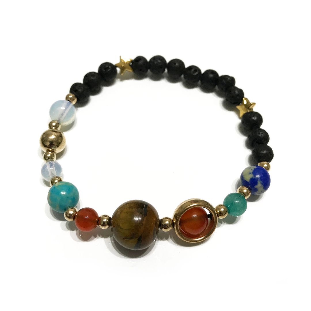 Explore the universe with this Lava Stone Bracelet - Gold Solar System. This unique piece features authentic lava stones representing the strength and grounding energy of Earth. Adorned with gold-plated planetary charms, each symbolising the celestial bodies of our solar system, this bracelet is a perfect blend of style and spirituality.