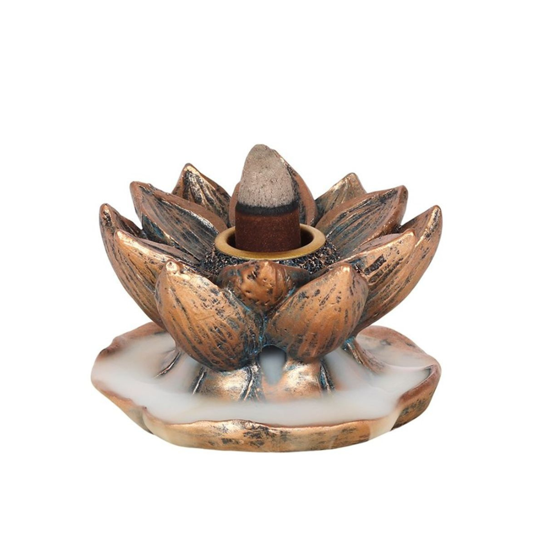 Elevate your ambiance with our Bronze Lotus Backflow Incense Burner. This elegantly crafted piece showcases a stunning lotus flower, a symbol of purity and enlightenment. It features a mesmerising backflow effect where incense smoke flows gently downwards, creating a serene and captivating display. Perfect for meditation, relaxation, or enhancing your home decor, this lotus incense burner brings a touch of tranquility and spiritual beauty to any space.