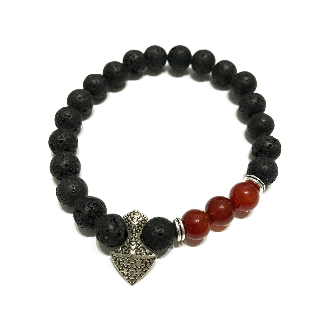 Harness bold energy and style with this Lava Stone Bracelet - Axe-head Carnelian. Featuring grounding lava stones and a distinctive axe-head carnelian charm, this bracelet exudes strength and vitality. Carnelian is known for its empowering properties, boosting confidence and courage.