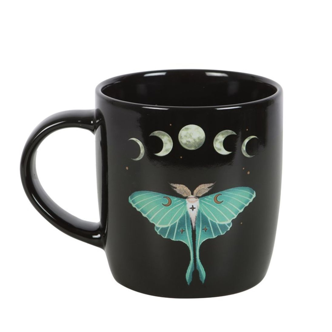 Add a touch of enchantment to your morning cuppa with our Luna Moth Mug. This black ceramic mug is adorned with a captivating and intricate luna moth design, featuring moon phases, stars, and flowers.