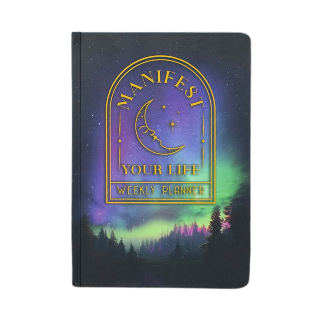 Stay organised and inspired with this magical A5 weekly planner notebook designed to uplift your spirit with every page. The cover features a captivating forest scene with the words 'Manifest your life' and a delicate moon image in gold foil. Holographic edging adds a hint of charm while a gold tassle page marker is a handy addition to easily find your place. Ideal for setting intentions and planning the week ahead, this notebook combines beauty and purpose—perfect for anyone ready to bring their dreams to life. 100 sheets with 200 lined pages