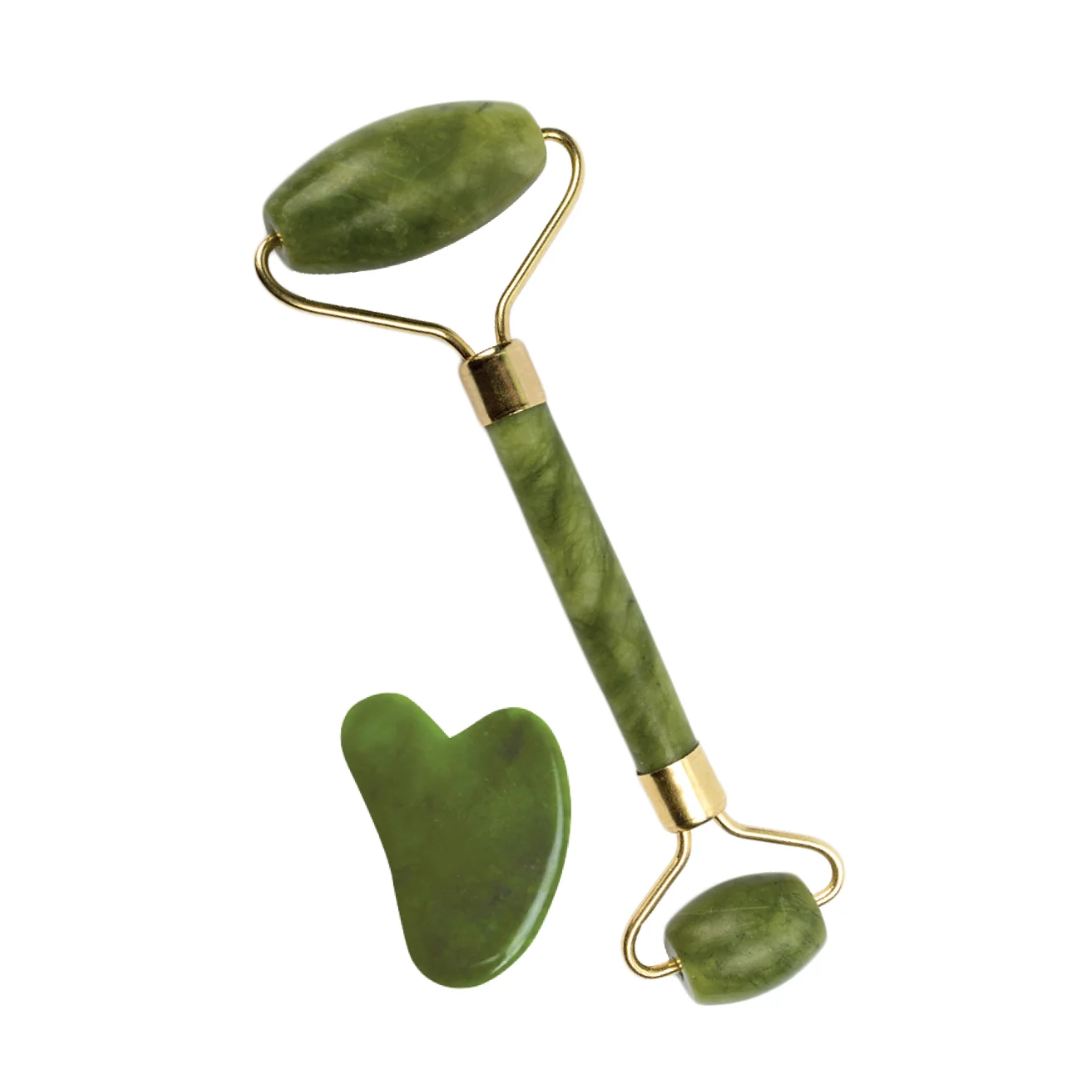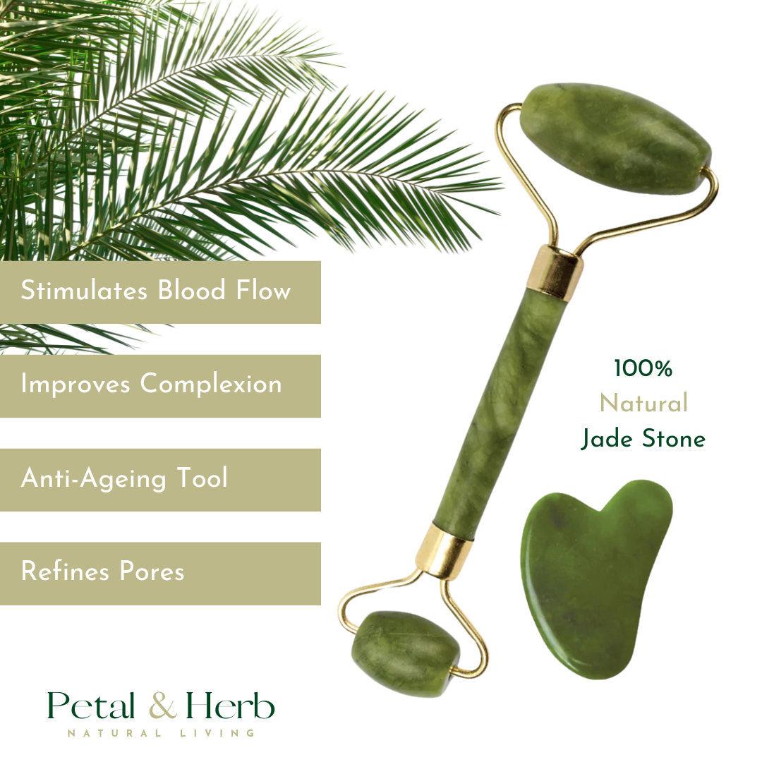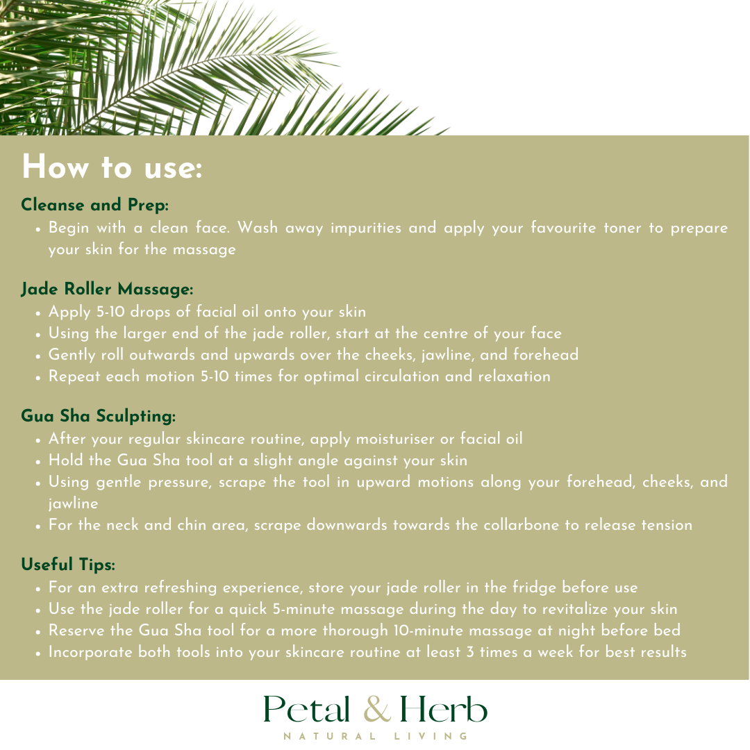 Indulge in the refreshing sensation of our pure Jade gemstone roller and Gua Sha set. Crafted for ultimate relaxation, these tools stimulate circulation, reduce tension, and promote a healthy glow. To use the roller, apply oil and gently massage upwards. For the Gua Sha, follow your skincare routine and gently scrape upwards. For best results, use both tools consistently.