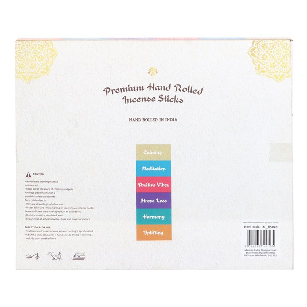 This gift set includes 6 packs of premium masala incense sticks in 6 popular fragrance combinations. Hand-rolled in India using traditional methods and vegan-friendly, these incense are great for meditation, self-care and spiritual rituals. Fragrances include Calming (Vanilla Indulgence), Meditation (Palo Santo & Sandalwood), Positive Vibes (Sweet Jasmine), Harmony (Palo Santo & White Sage), Stress Less (Lavender & White Sage) and Uplifting (Copal & Sandalwood).