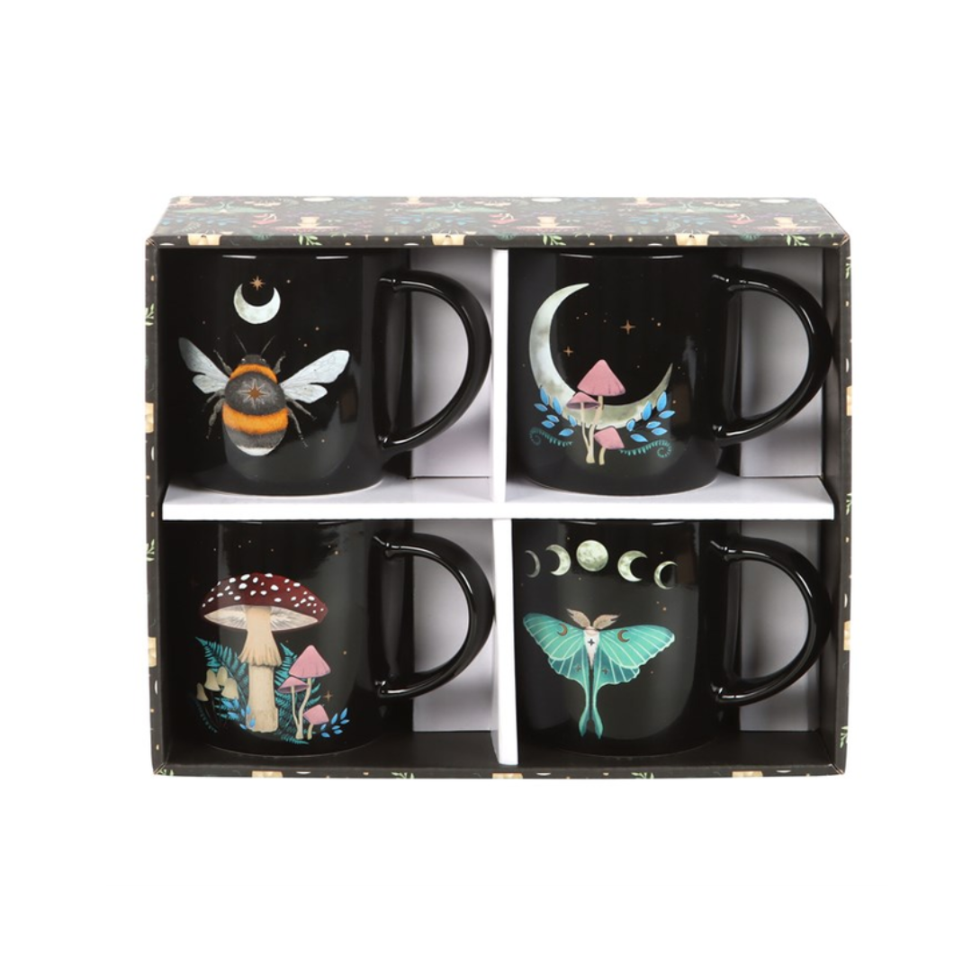 - Unique Designs: Each mug features a different enchanting design, including a luna moth, toadstools, and a bee, all accented with moon and star details for a touch of celestial wonder.